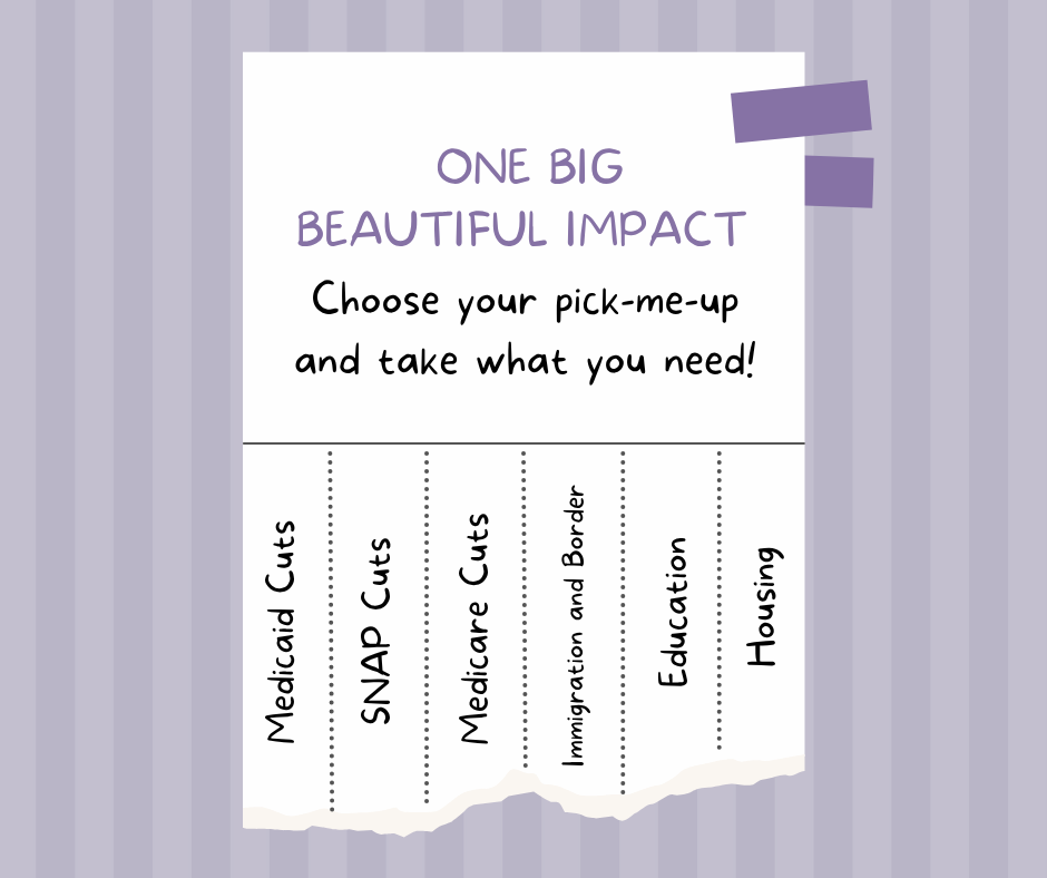 One Big Beautiful Impact: Are you curious about the impacts of the One Big Beautiful Bill Act (HR 1). In totality, over 3 million families are expected to lose SNAP assistance due to paperwork and work requirements, and we are concerned that less wealthy states may be forced to drop out of SNAP entirely if they can not make new required cost expectations in late 2027.