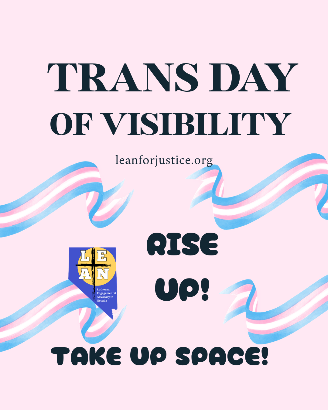 Lutheran Engagement and Advocacy in Nevada celebrates the vibrancy and resilience of the trans community. On this Transgender Day of Visibility, we uplift not only those who are able to live openly, but also those who cannot—those who, for their own safety, are not yet able to come out and live fully into their authentic truth in a world that can still be hostile.