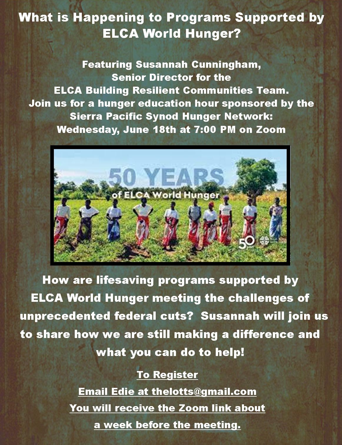 How is ELCA World Hunger responding to major federal funding cuts? Join the Sierra Pacific Synod Hunger Network on June 18 at 7 pm via Zoom as we hear from Susannah Cunningham, Senior Director for the ELCA Building Resilient Communities Team, and learn how these programs are still making a difference—and how you can help.
