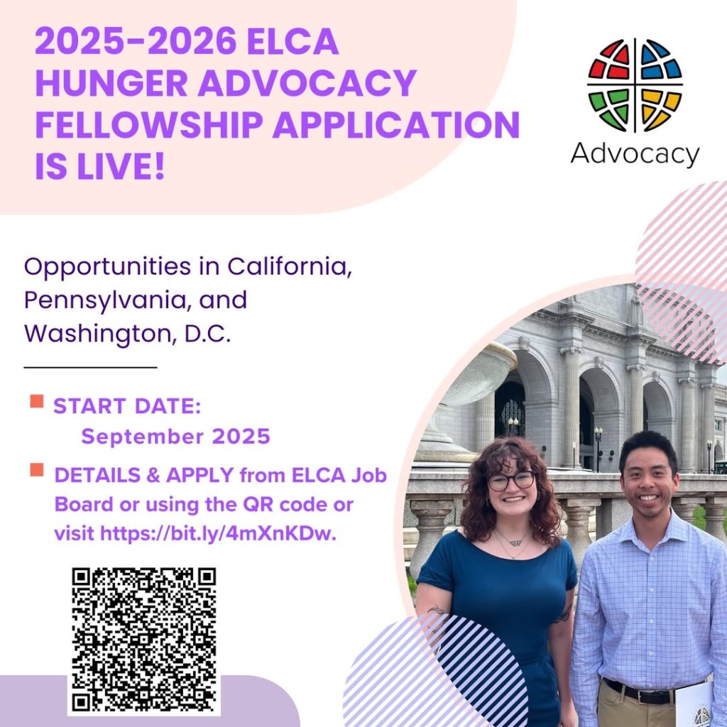 Work experience, faith-centered advocacy and opportunity for discernment and networking come together in ELCA Hunger Advocacy Fellowships, and we’re hiring for the 2025-26 cycle starting Sept. in California, Pennsylvania and Washington D.C.! Apply using the QR code or the button below.