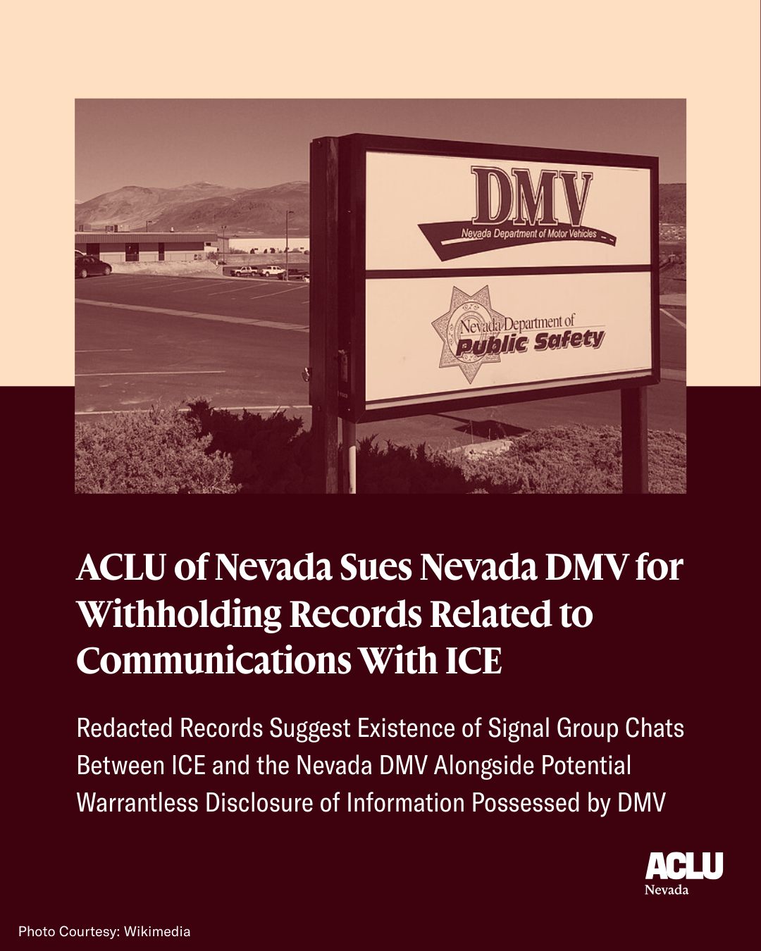 ACLU of Nevada is suing the Nevada DMV for refusing to turn over public records about its communications with ICE, which seemingly include references to a Signal group between DMV staff and ICE officials. Public records belong to the people. Follow ACLU of Nevada for updates.