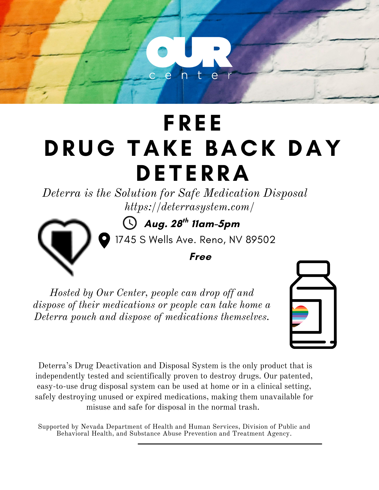 On Thursday, August 28th 11am-5pm anyone can come pickup a FREE Deterra pouch to safely dispose of their medications at home or they can drop off their unused/expired medications and we’ll safely dispose of the medications for the general public.