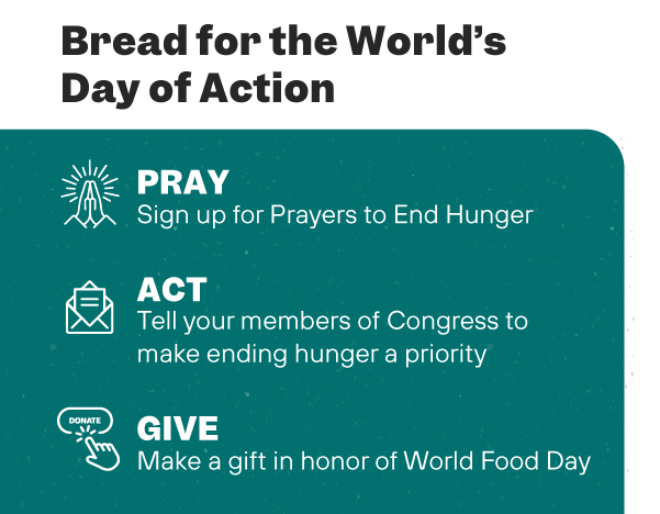 Please join us in our Day of Action! Your generosity, including an early gift in honor of World Food Day, will support our work to advocate for life-saving legislation and help MILLIONS of people worldwide.