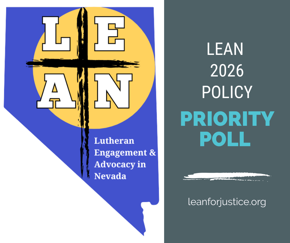 Lutheran Engagement and Advocacy in Nevada (LEAN) invites congregations across the state to participate in our 2026 Policy Priority Poll. Your input will help guide LEAN’s advocacy work during the upcoming Nevada Legislative Session.