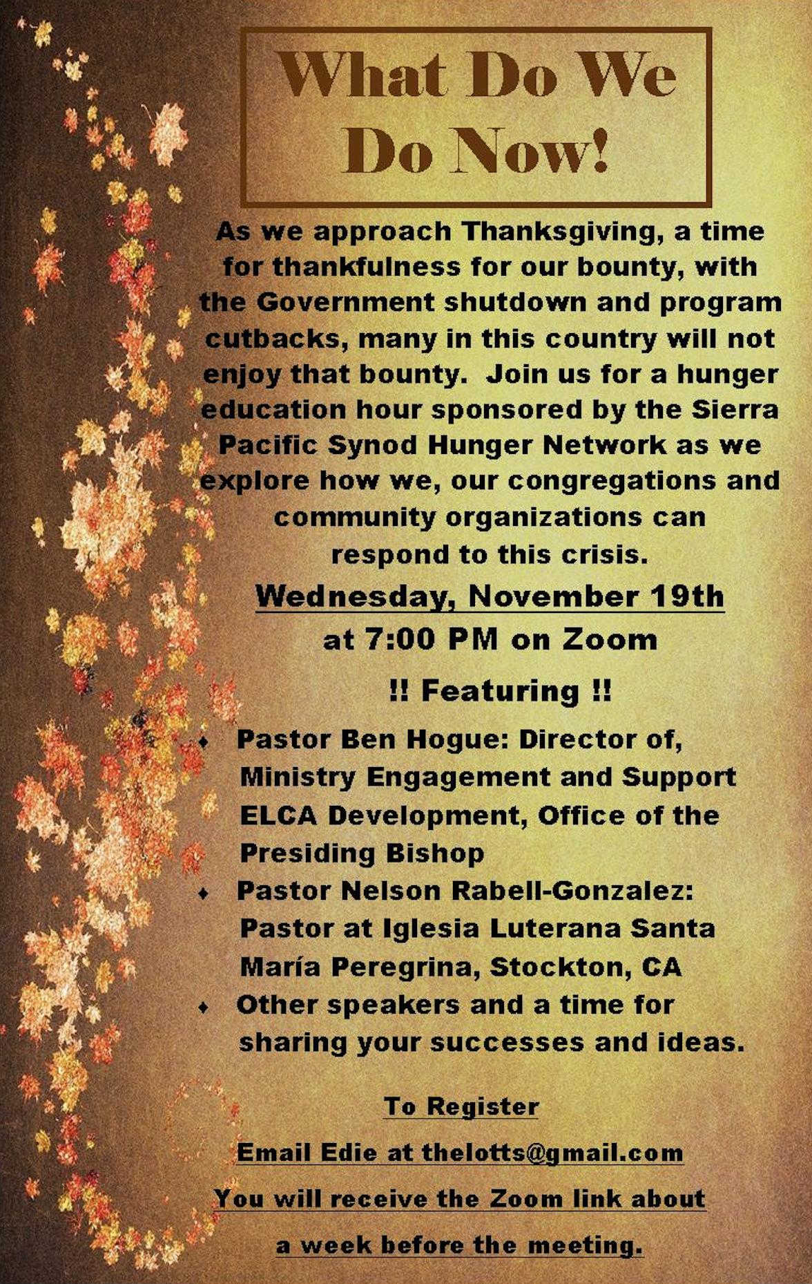 Join the Sierra Pacific Synod Hunger Network on Wednesday, November 19, at 7 pm on Zoom as we explore how to address the hunger crisis. To register, email Edie Lott at thelots@gmail.com.