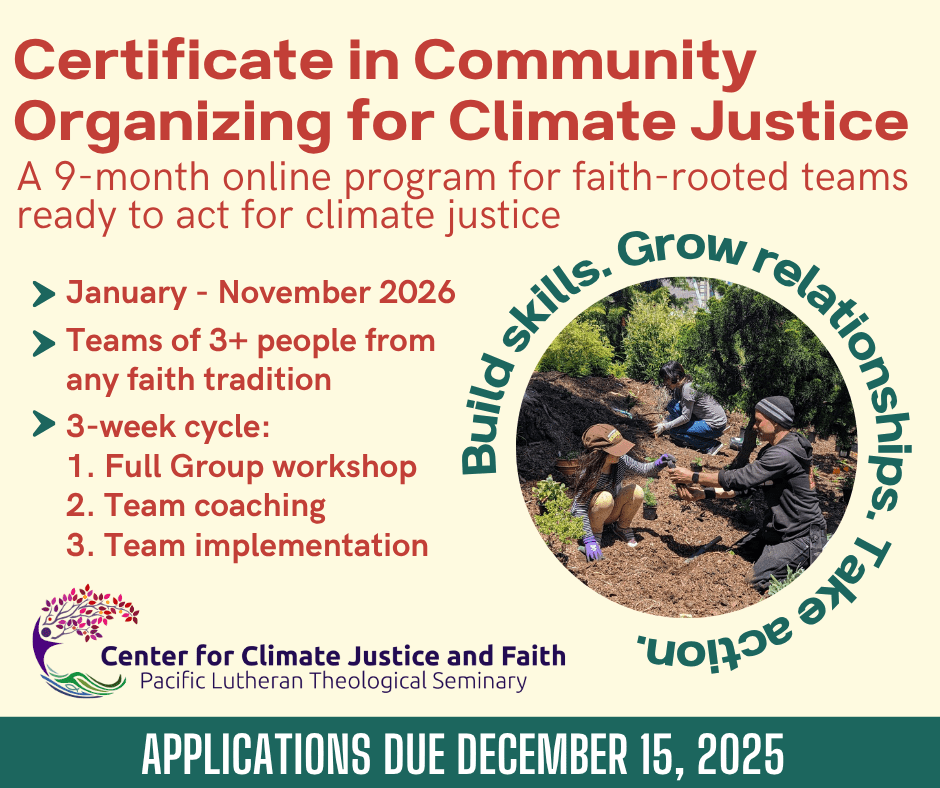 The Center for Climate Justice and Faith (CCJF) at Pacific Lutheran Theological Seminary (PLTS) is now accepting applications for two certificate programs that connect faith, community organizing, and environmental action: