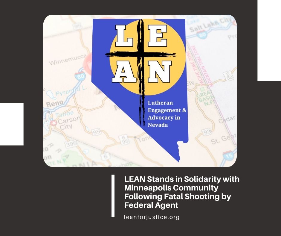 Lutheran Engagement and Advocacy in Nevada (LEAN) stands in solidarity with the community of Minneapolis and the family of Alex Jeffrey Pretti, a U.S. citizen and ICU nurse who was fatally shot by a U.S. Border Patrol agent on Saturday, January 24, 2026.