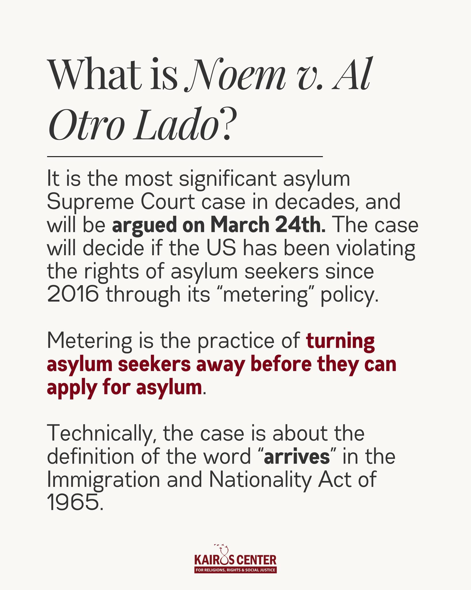 The ELCA is part of an interfaith amicus brief in Noem v. Al Otro Lado, a Supreme Court case on asylum restrictions. Ahead of oral arguments, join the ELCA and faith partners for a vigil in front of the Supreme Court on March 24 at 8:00 a.m. Together, we’ll sing, pray, and declare “No Turning Back” on the sacred and ancient right to asylum. Learn more at https://www.asylumsaveslives.org/.