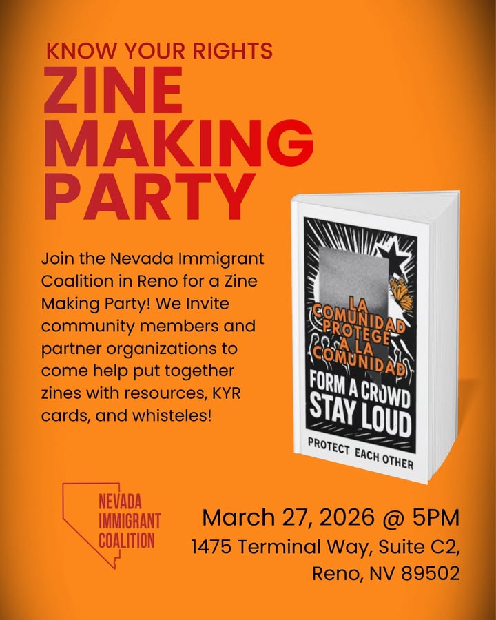 Know Your Rights March 24, 2026 / paullarson Join the Nevada Immigrant Coalition in Reno for a Zine Making Party! We invite community members and partner organizations to come help put together zines with resources, KYR cards, and whistles! March 27, 2026 @ 5PM Share this: Share on X (Opens in new window) X Share on Facebook (Opens in new window) Facebook Like Loading... Related