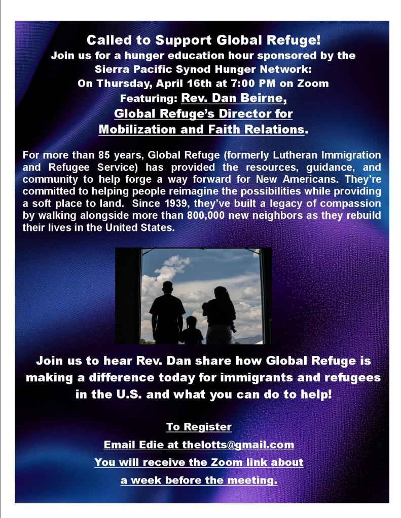 Join us for a hunger education hour sponsored by the Sierra Pacific Synod Hunger Network: On Thursday, April 16th at 7:00 PM on Zoom Featuring: Rev. Dan Beirne, Global Refuge’s Director for Mobilization and Faith Relations.