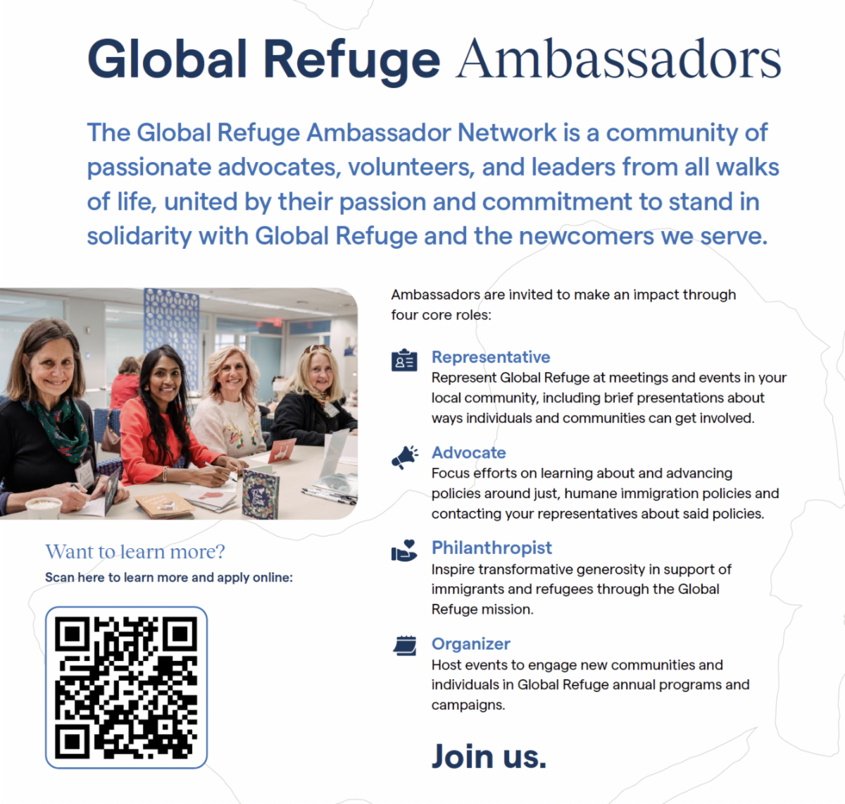 Join the Global Refuge Ambassador Network (formerly Lutheran Immigration and Refugee Service – LIRS) and make a meaningful impact alongside a community of passionate advocates, volunteers, and leaders.