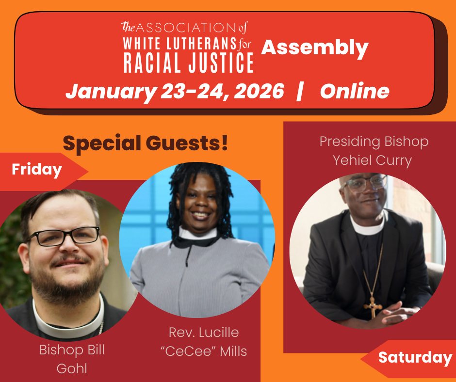 You’re invited to join the White Lutherans for Racial Justice (ELCA Association of White Lutherans) for a thoughtful and faithful online gathering January 23-24, 2026 centered on learning, reflection, and conversation. This event creates space for white Lutherans committed to accountability, to naming and dismantling racism within themselves and systems, and to choosing repair, justice, and deeper community together.